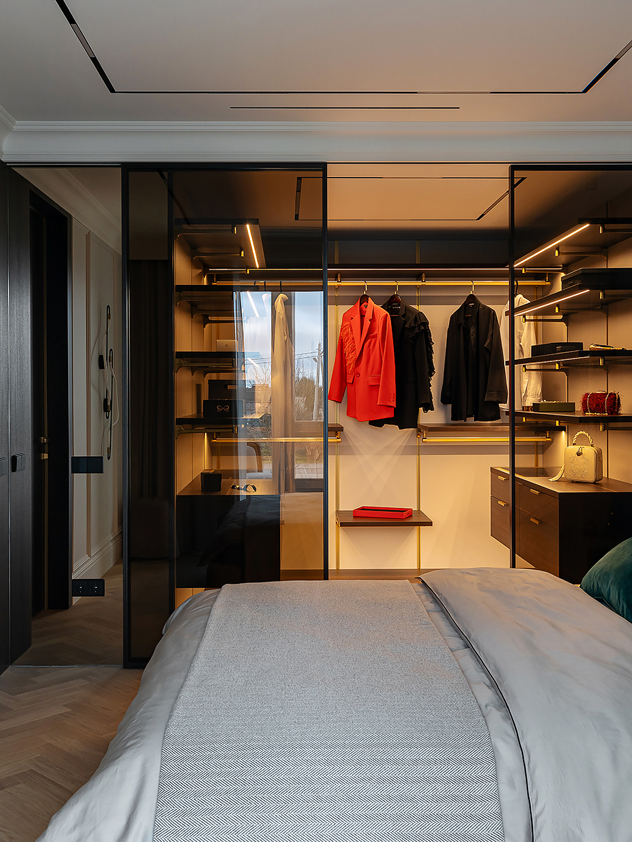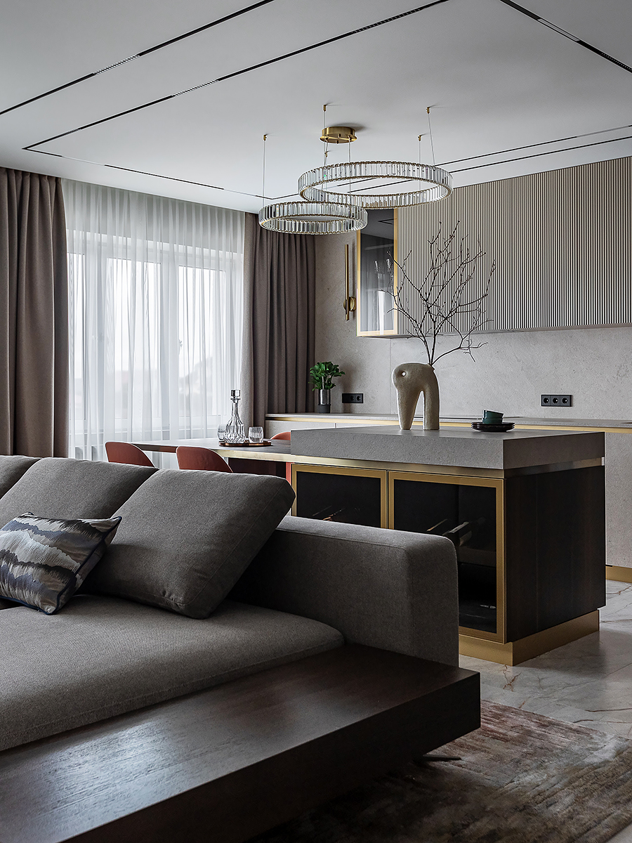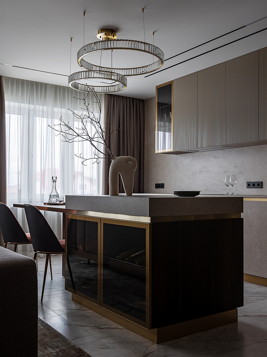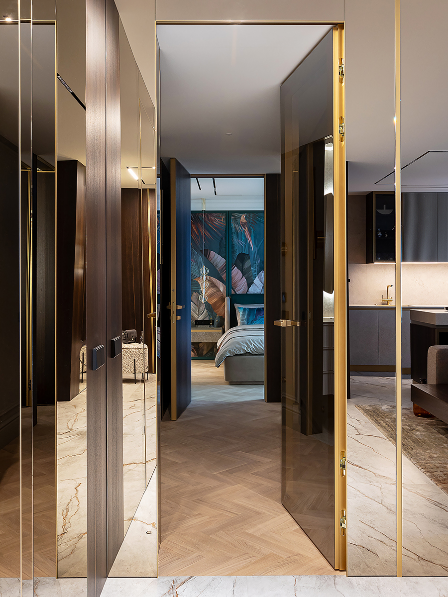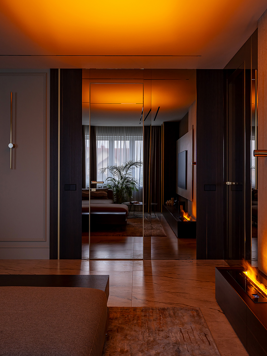Интерьер квартиры разделен на две функциональные зоны: общую и приватную. Общая зона объединяет прихожую, гардероб, просторную кухню-гостиную и гостевой санузел. Здесь сочетаются комфорт и элегантность, подчеркивая открытый характер дома. Личная часть квартиры отделена стеклянной дверью с отражающим эффектом. Она органично вписывается в интерьер за счет зеркальных стен, создавая ощущение простора и уединения одновременно.