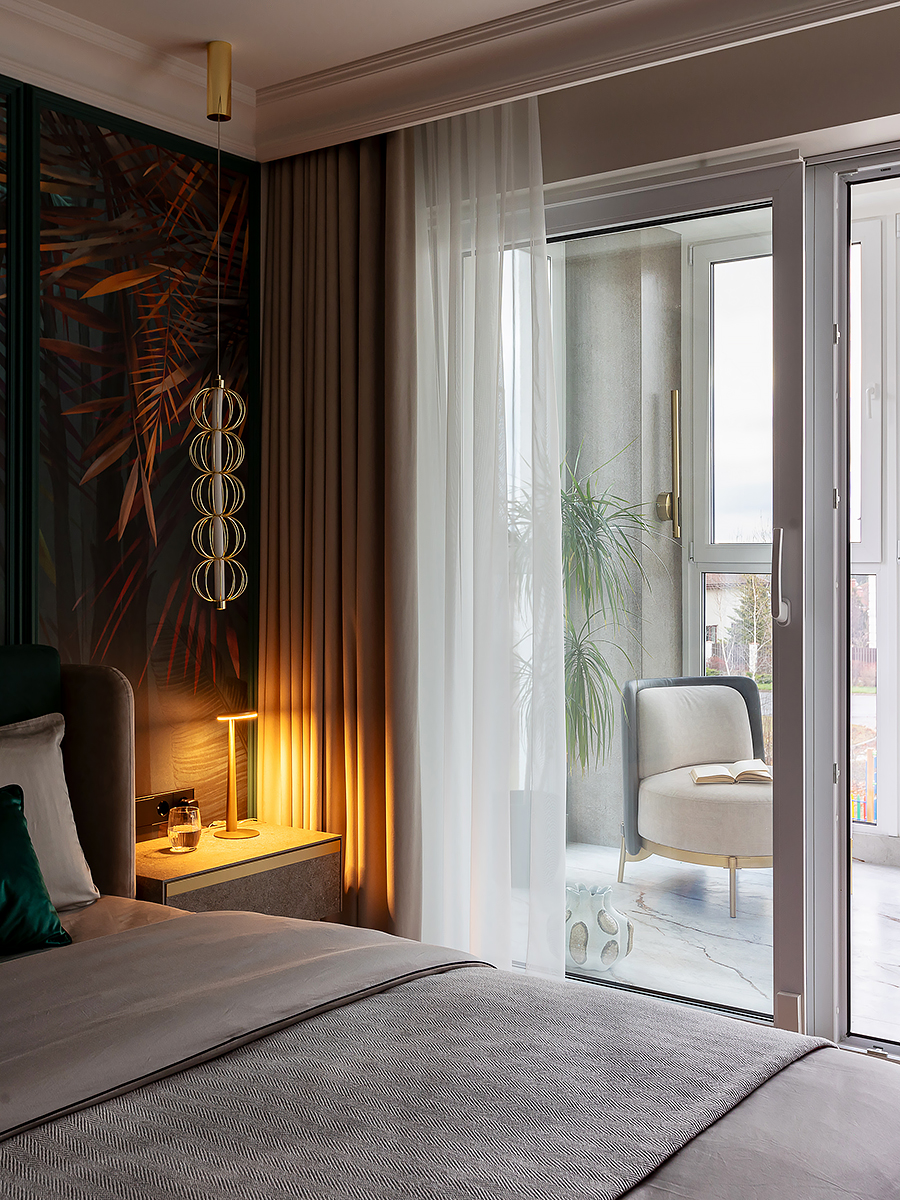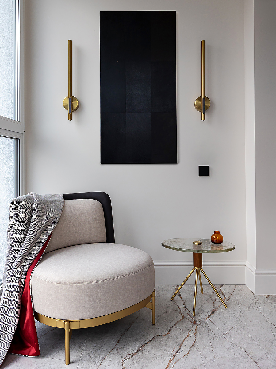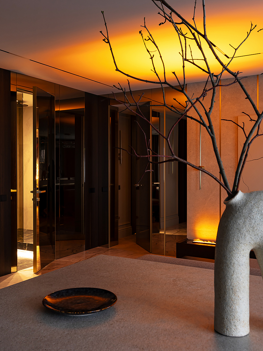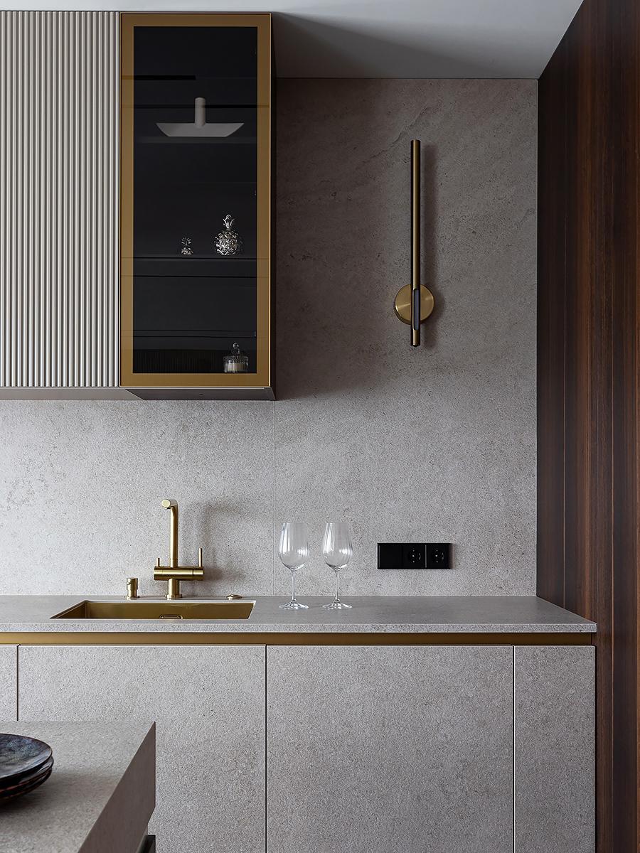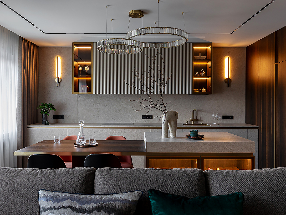 Интерьер квартиры разделен на две функциональные зоны: общую и приватную. Общая зона объединяет прихожую, гардероб, просторную кухню-гостиную и гостевой санузел. Здесь сочетаются комфорт и элегантность, подчеркивая открытый характер дома. Личная часть квартиры отделена стеклянной дверью с отражающим эффектом. Она органично вписывается в интерьер за счет зеркальных стен, создавая ощущение простора и уединения одновременно.