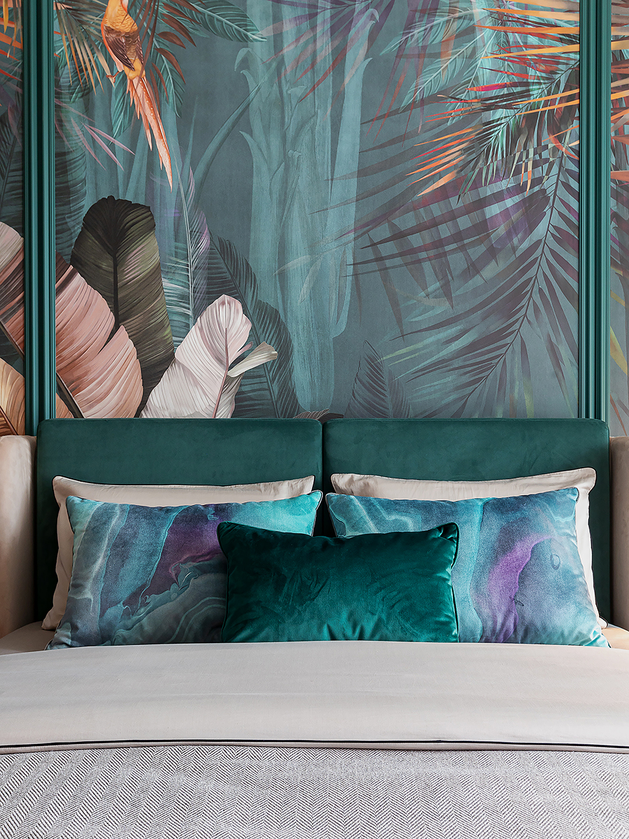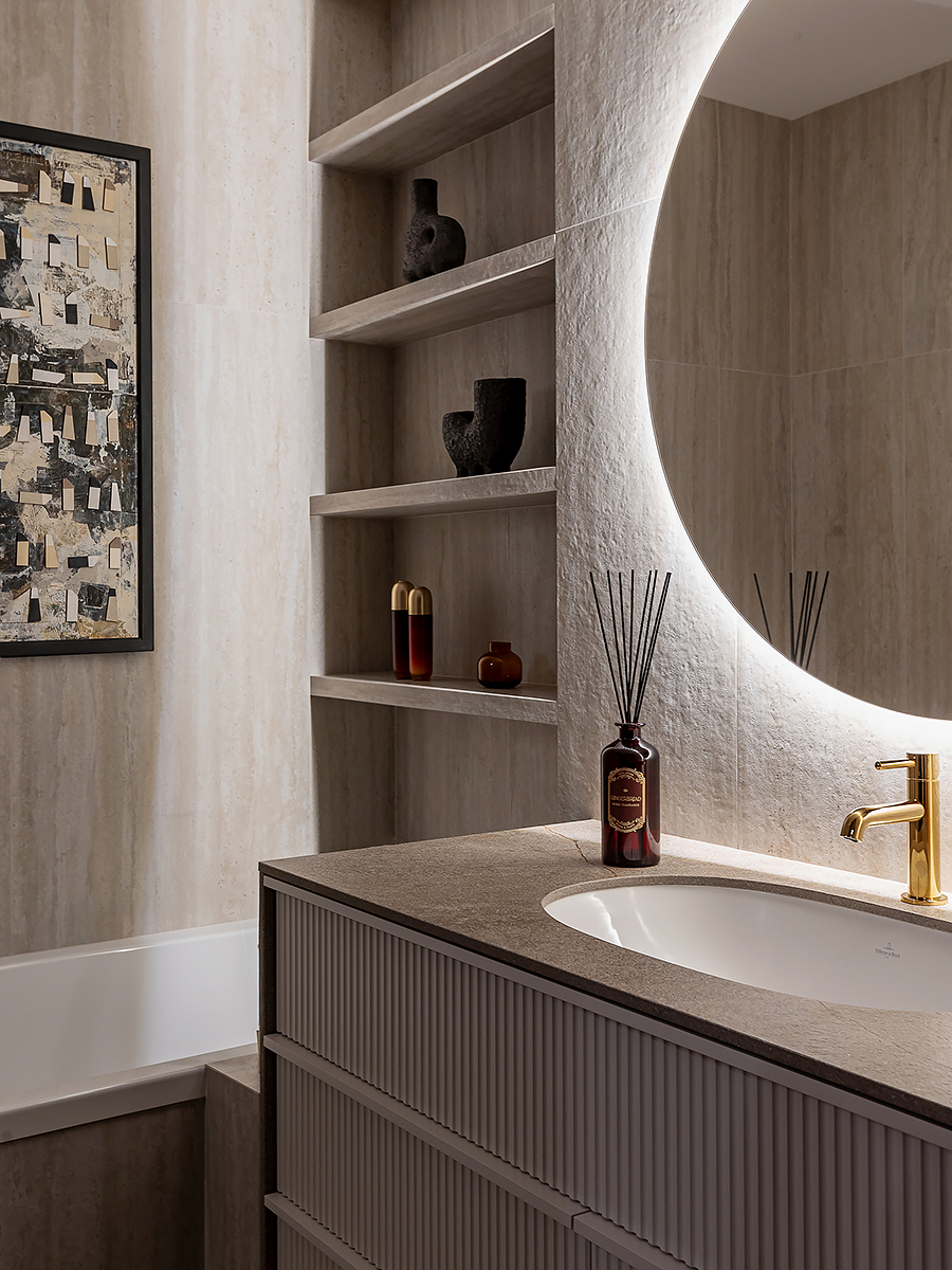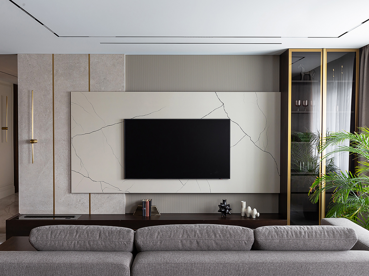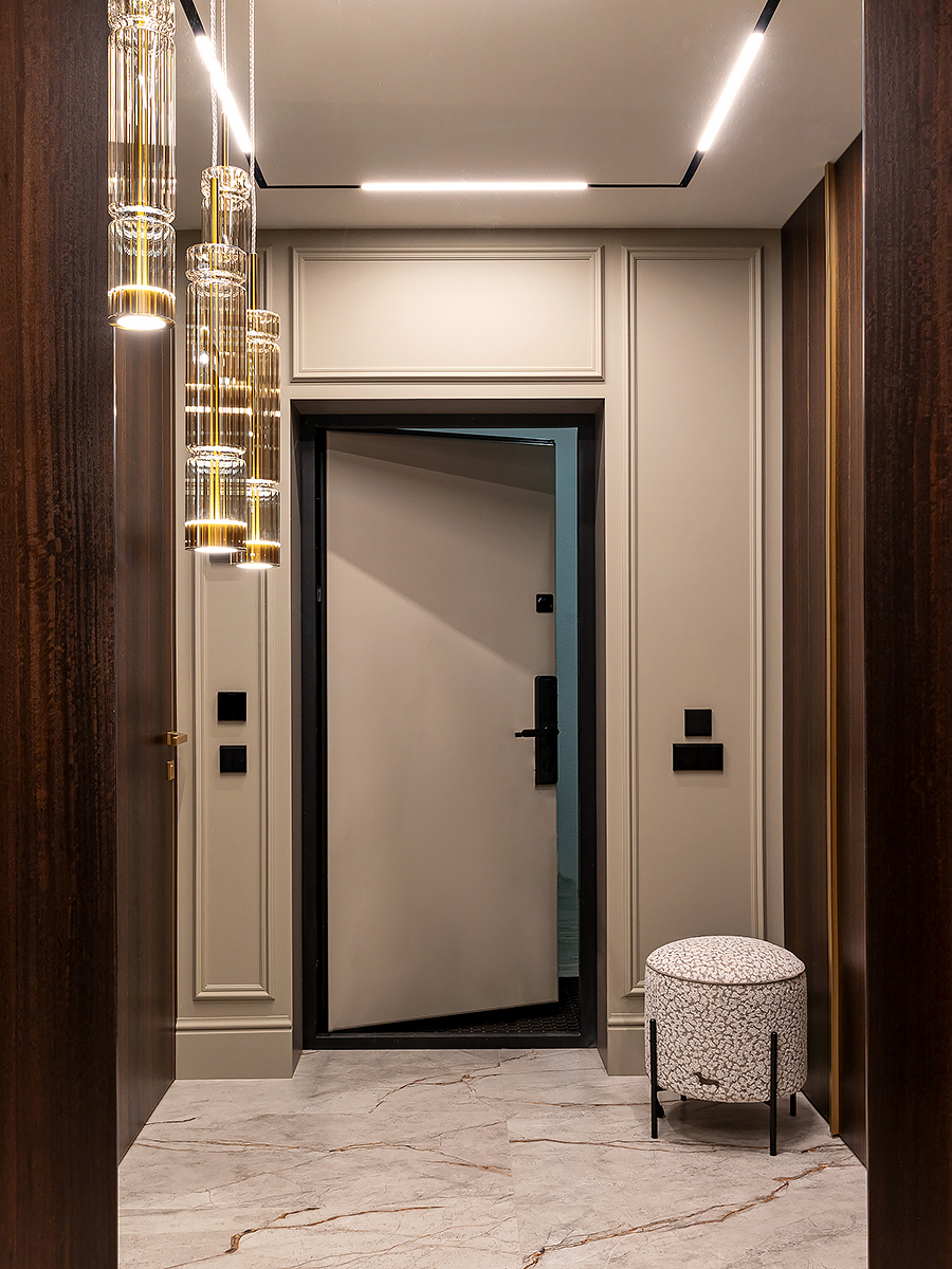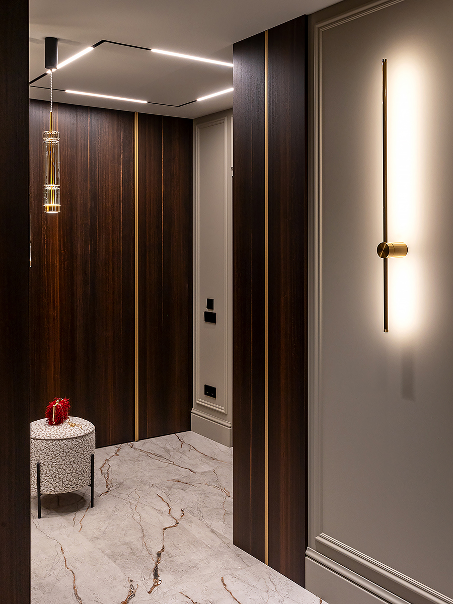Основной акцент сделан на натуральных материалах и благородных фактурах. В отделке стен использованы разные форматы: матовая краска, зеркальные вставки, шпонированные панели и декоративные панно. Благодаря такому сочетанию пространство получилось разнообразным, но при этом выдержанным в едином стиле.