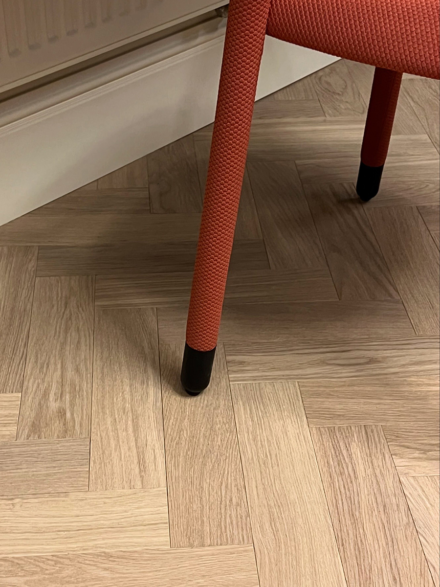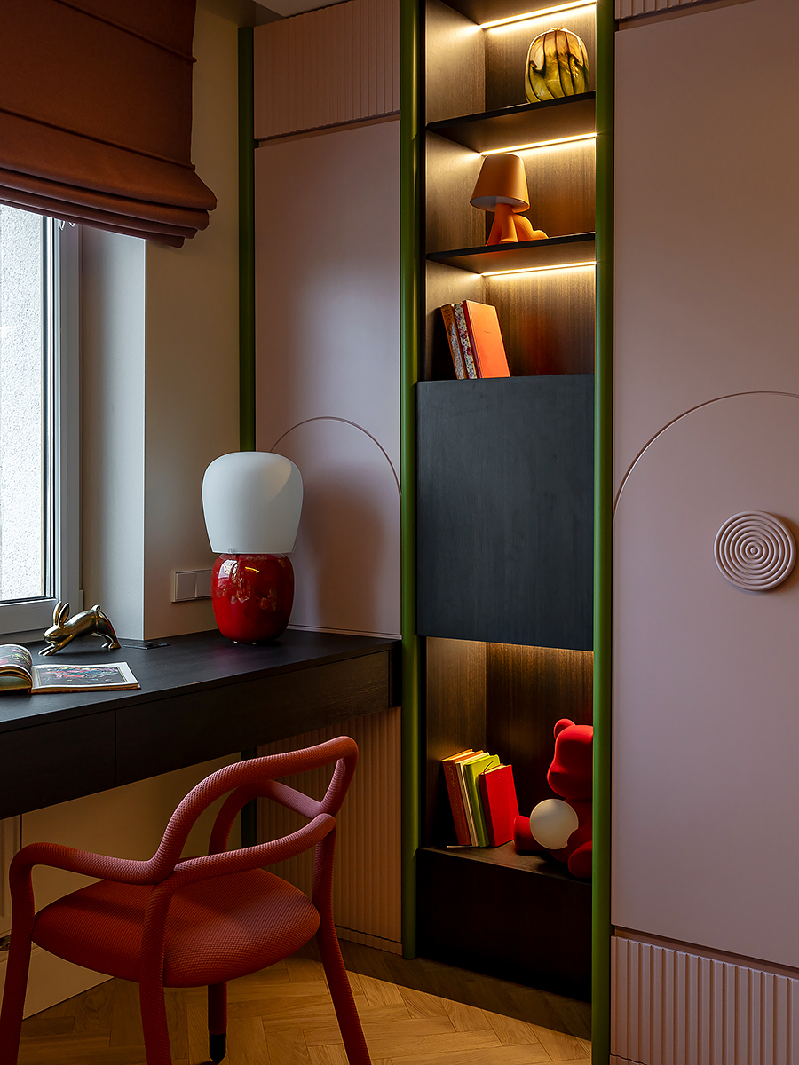 Особую роль в проекте играет дерево. Двери и корпусная мебель облицованы натуральным шпоном из ценной породы древесины — эвкалипта. На полу – английская елка из дуба – дань традиции в современном прочтении. Чёткие линии и геометричный рисунок создают динамичный, но сбалансированный узор, который придаёт интерьеру характер и утончённость. Дизайнеру удалось добиться идеального совпадения оттенков и текстур, что придало интерьеру завершенность.