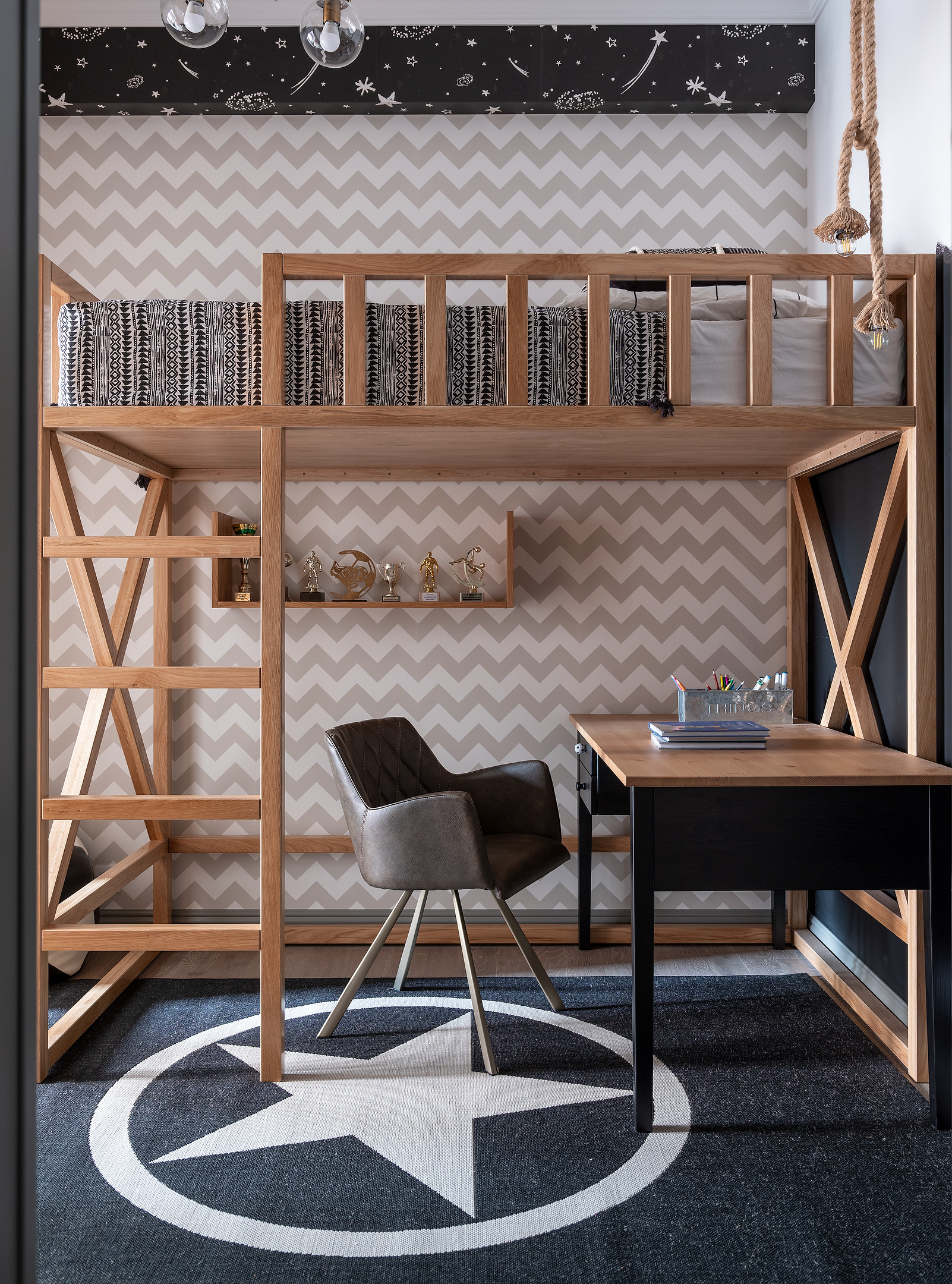 Из положения вышли, разделив комнату пополам с помощью раздвижных дверей с пенальной системой. Таким образом, в течение дня дети могут играть в просторной комнате, при этом у каждого есть собственная территория и отгороженное спальное место. Текстиль и предметы декора поддерживают этнические мотивы. На кухонной стене висит килим ручной работы, в спальне пришелся к месту дагестанский платок, вышитый вручную золотыми нитями, и даже от картины Андрея Калугина в прихожей веет какой-то восточной магией.
