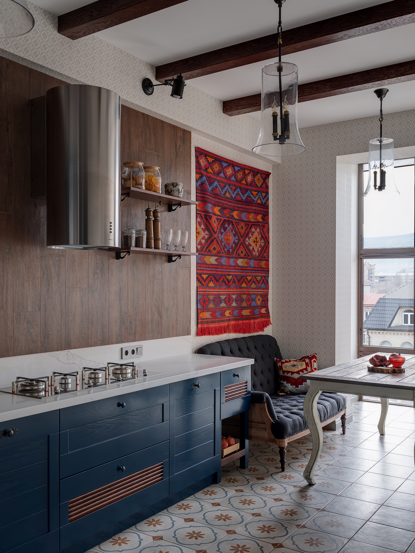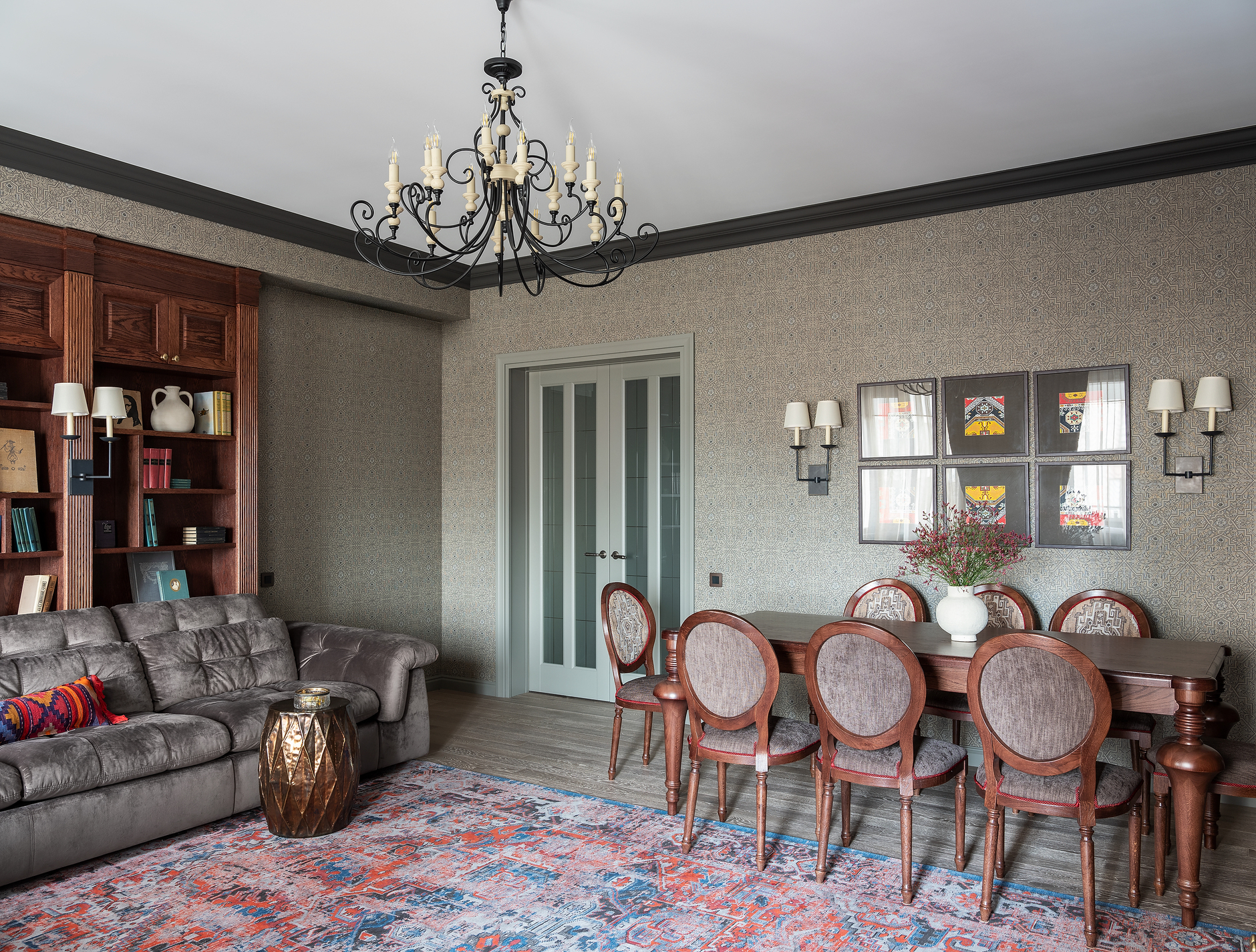 Это и стало отправной точкой: все материалы выбирались по принципу фактурности, сложности узоров и цветов. Мебель из масс-маркета даже не рассматривалась, поэтому основную ее часть изготавливали на заказ.