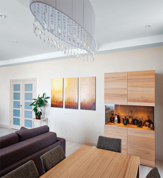 Простые формы, не загромождающие пространство, преобладают и в гостиной. Здесь хозяева по вечерам могут наблюдать за закатом. Мягкие приглушенные цвета успокаивают, фактура материалов создает атмосферу уюта. Отдыхая у телевизора на мягком диване или неспешно беседуя за столом с гостями, хозяева провожают солнце, чтобы на следующий день снова встретить его в своей спальне.