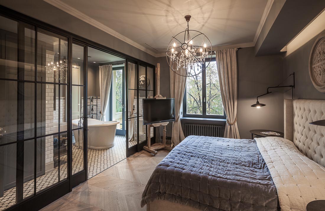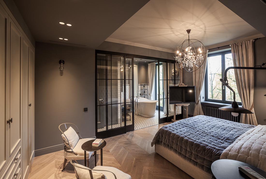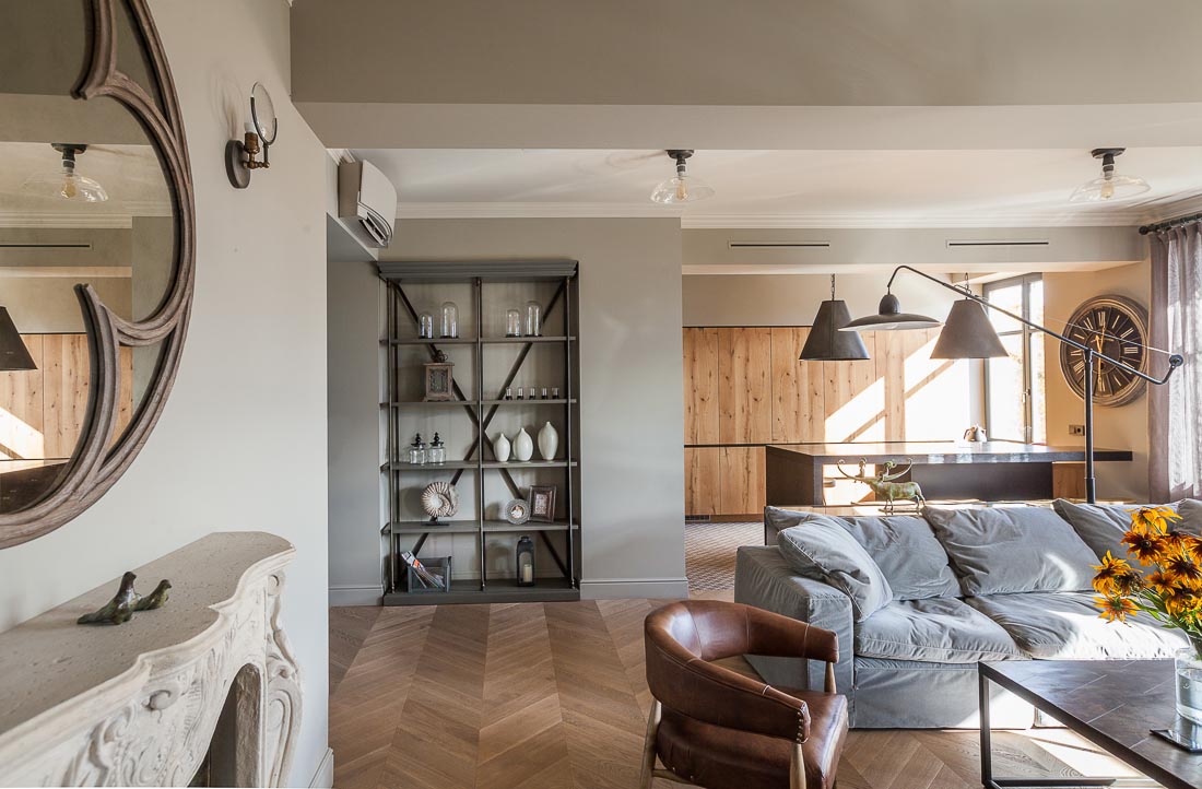 В проекте применен паркет «французская елка» дуб Пастель.