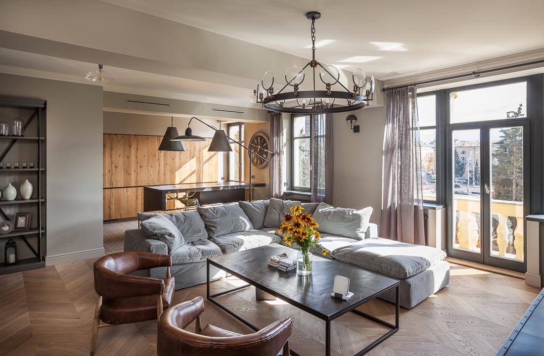 В этом проекте мы максимально использовали все преимущества пространства и удачное расположение квартиры. Окна гостиной, кухни и кабинета выходят на восток, а спальные комнаты с двумя балконами и видом на тихий двор с тенистыми деревьями— на запад.