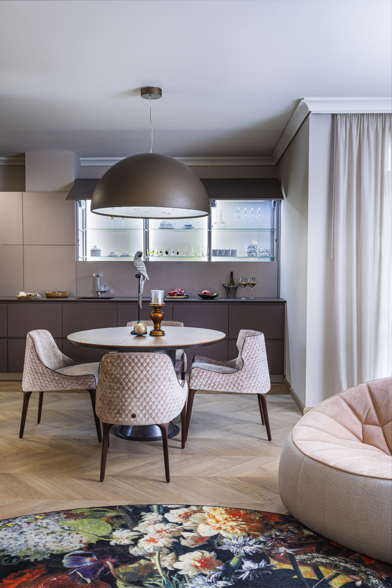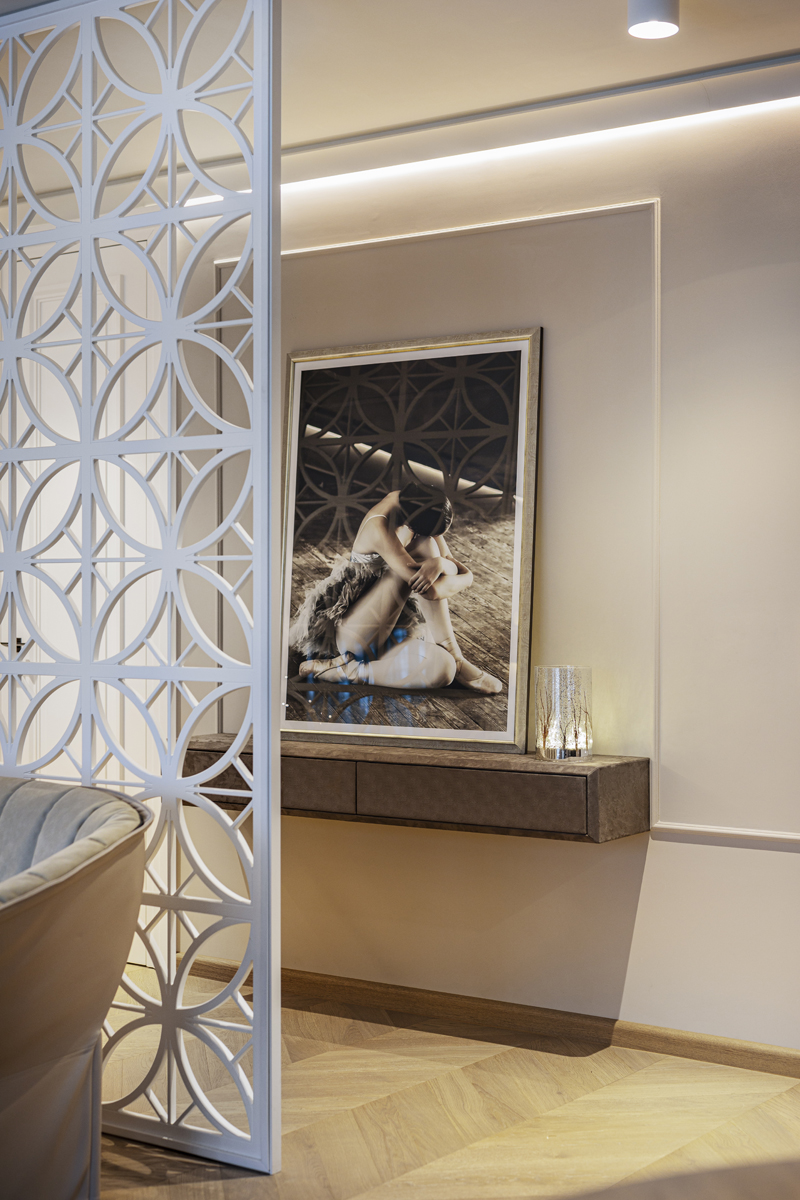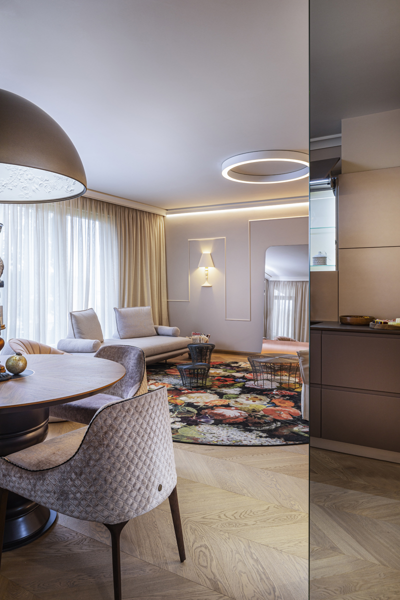 Небольшая, но очень изящная женская квартира в современном стиле с элементами классицизма от болгарского дизайнера Ina Damyanova. Комбинация нежных пастельных оттенков и плавных линий с яркими цветочными акцентами, контраст простых форм и богатых деталей отделки создают небанальную интерпретацию классического интерьера – мягкого и элегантного.