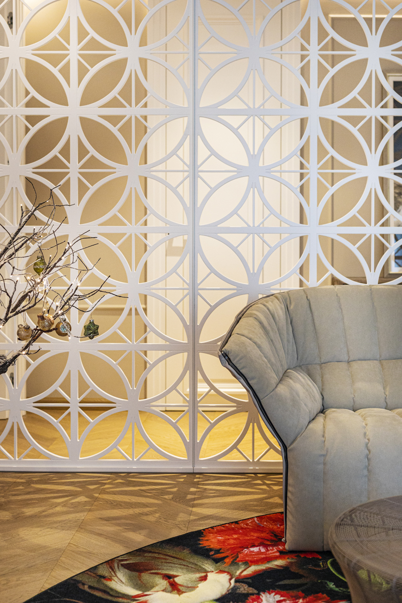 В проекте использованы трехслойная паркетная доска Coswick дуб Пастель, «французская елка» дуб Пастель.
