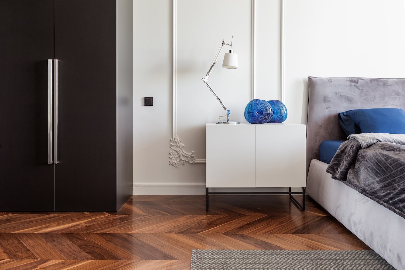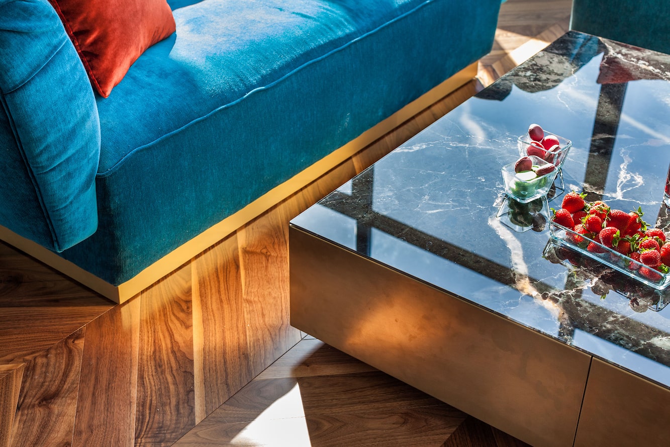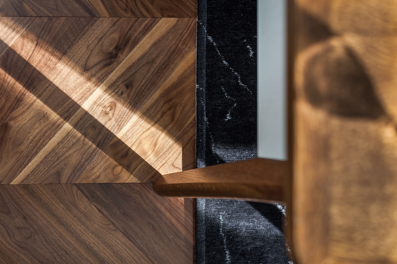 В проекте применен паркет «французская елка» американский орех, лак, Селект энд Бэттер, Натуральный.