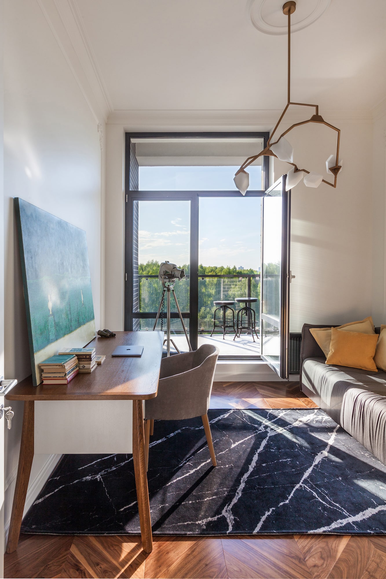 Проект создавался для молодого, пока не семейного человека. Придерживались концепции приватности, оставив при этом в общей стилистике холостяцкий лейтмотив.