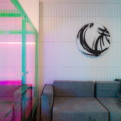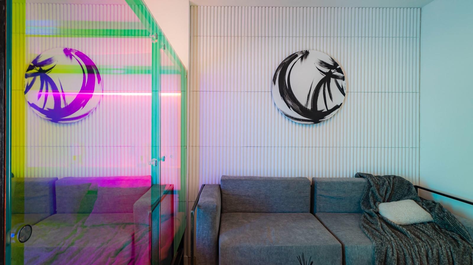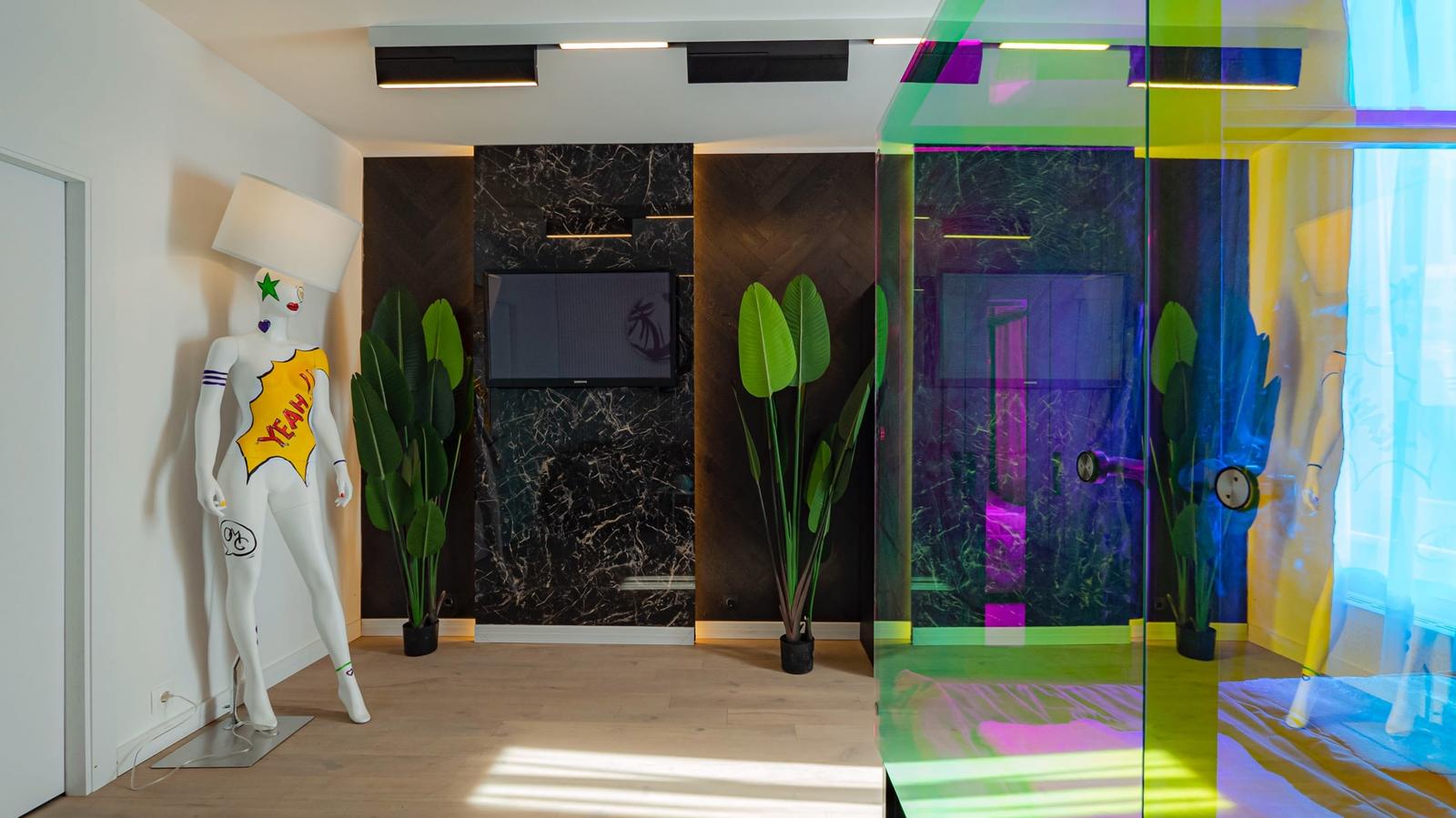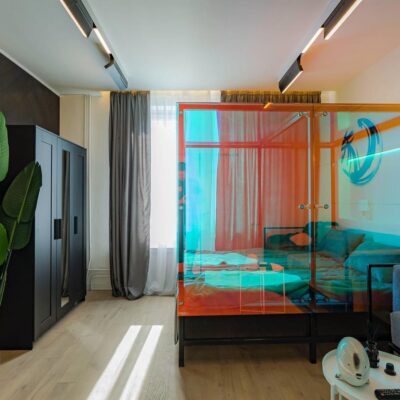 Дизайнер смело работает с цветом и фактурами. Для пола он выбрал паркетную доску сложного светлого оттенка с «глубокой сединой», одну из стен оформил «английской елкой» и мраморным керамогранитом черно-серых тонов, другие оставил белыми, придав им фактуру гипсовыми панелями. А спальную зону выделил прозрачными стеклянными перегородками. Смелые решения, авторские дизайнерские объекты – и повышенное внимание к качеству и удобству.