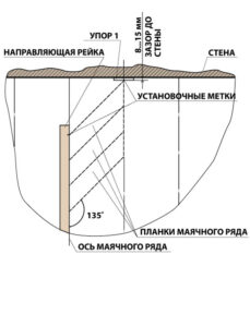 • При помощи угломера или шаблона проверьте угол 135 градусов. Установите упор для предотвращения сдвига планок при установке. Упор устанавливается таким образом, чтобы выдерживался компенсационный зазор до стены. Величина зазоров рассчитывается исходя из размеров помещения в направлении зазора, по 1,5 мм на каждый метр, но зазор не должен быть меньше 8 мм. Убедитесь, что расширительный зазор будет впоследствии полностью закрыт плинтусом.