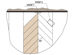 - После того, как установлен и зафиксирован маячный ряд, укладка продолжается вправо от него. Для первой планки следующего ряда нужно установить упор. Упор базируется аналогично, по собранным без клея трём правым планкам, с контролем угла 45 градусов. Установка второго ряда производится по технологии, описанной в установке маячного ряда. Контроль точности установки аналогичен.